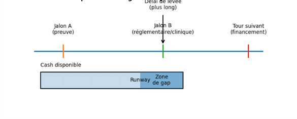 Le runway n’est pas qu’un ratio “cash / burn”. En santé, il faut aussi intégrer le calendrier des jalons, les décalages administratifs (subventions, remboursements) et la dépendance éventuelle à des financements conditionnés. Quand une levée s’allonge, l’effet peut être très concret : ralentir un programme, décaler un recrutement de patients, ou rater une fenêtre réglementaire.¹